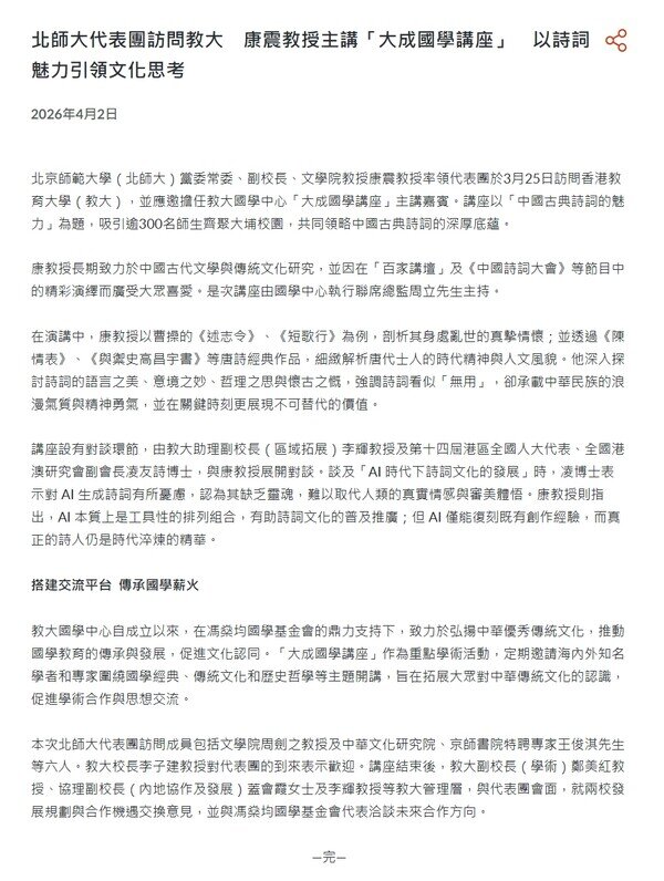 北師大代表團訪問教大 康震教授主講「大成國學講座」 以詩詞魅力引領文化思考
