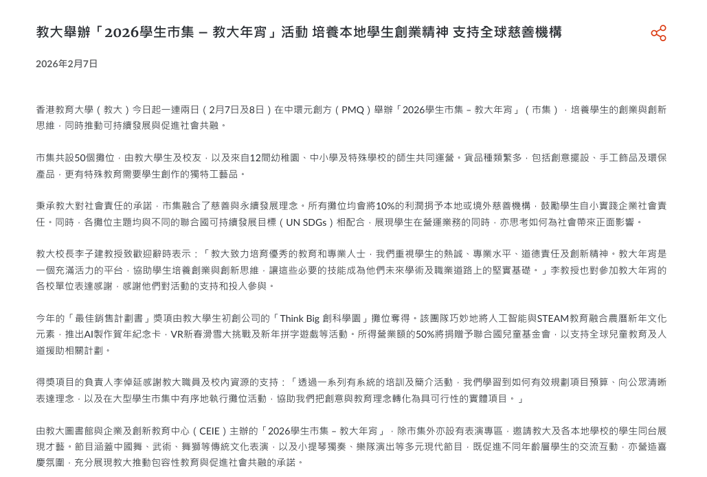 教大举办「2026学生巿集 – 教大年宵」活动 培养本地学生创业精神 支持全球慈善机构